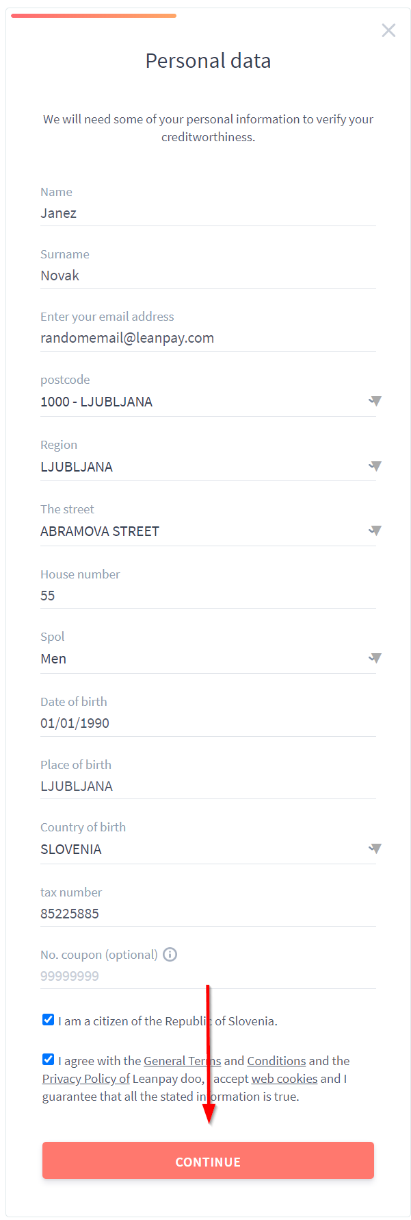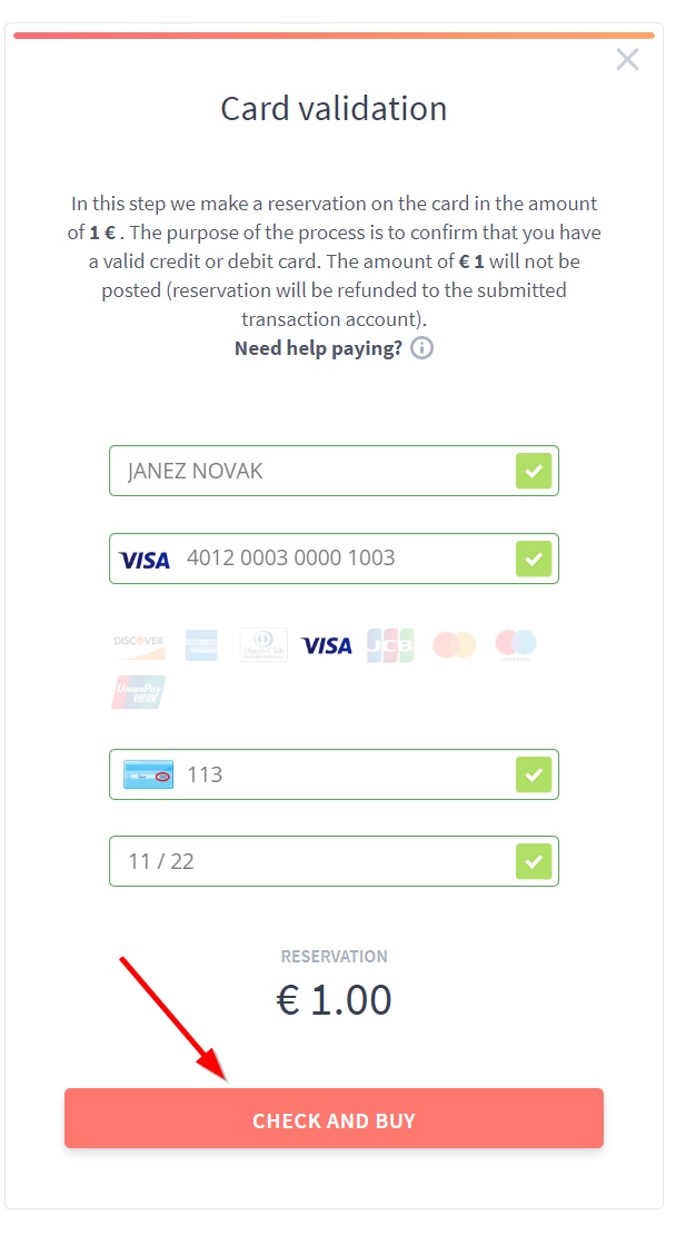 - E-mail and TAX number must be unique on every purchase, the system will warn you if they were already used