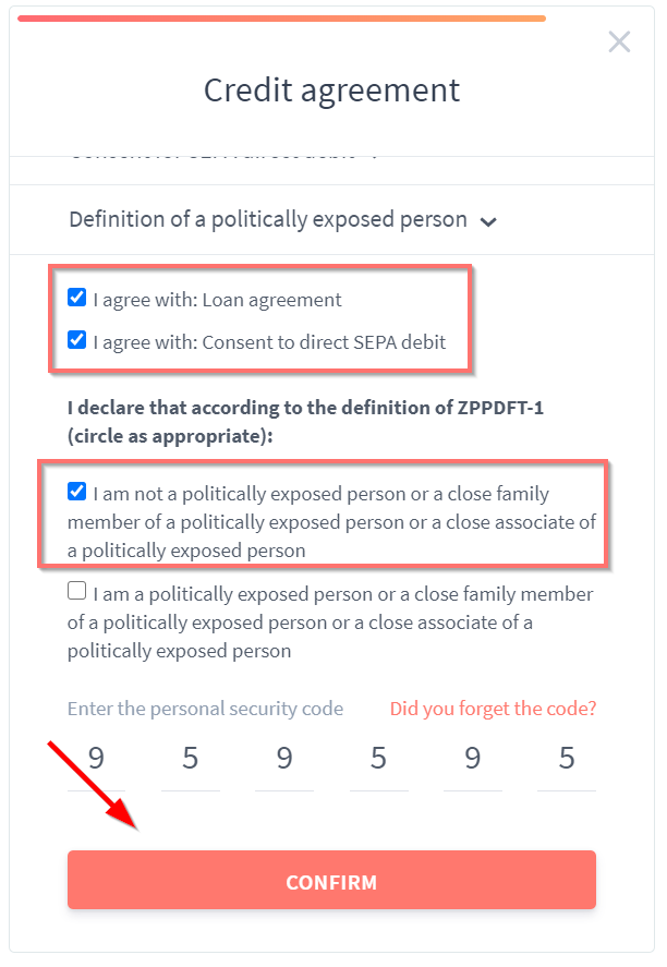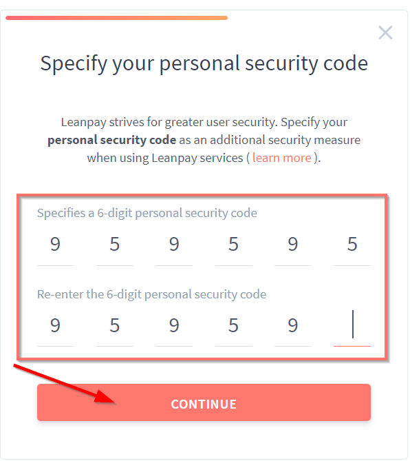 - Specify security code (REMEMBER THE CODE,YOU WILL NEED IT AT THE END OF THE PROCESS)